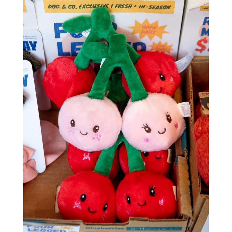 A cherry-sweet duo for playtime fun. This 2-pack features plush cherries with crinkly textures and squeakers inside to keep pups engaged. Perfect for tossing, cuddling, and adding a pop of fruity fun to every play session.Sizing: 3" (each cherry)